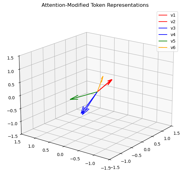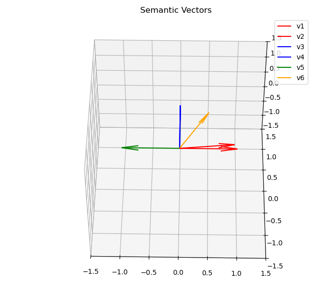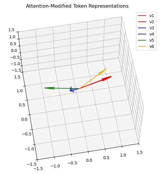 These two perspectives show that v6 has been found to be contextually correlated with v1 and v2 (which are still contextually correlated anyway) and contextually decorrelated from v3 and v4. Obviously, this is just an oversimplified projection that I wrote to understand the purpose of each part. In a real transformer model, or better yet, something as big as ChatGPT, it’s not as straightforward. It takes many iterations and an incredibly large dataset to actually get the correct contextual meaning as shown in the last example with rotations.