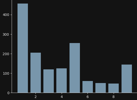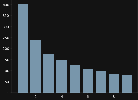 \[\begin{aligned} P(d) = \log_{10}\left(1 + \frac{1}{d}\right), \quad d = 1, 2, \dots, 9 \end{aligned}\]And looks like this: